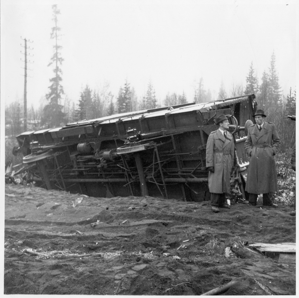 Män framför urspårad vagn mellan Håmojåkk och Linaälv.