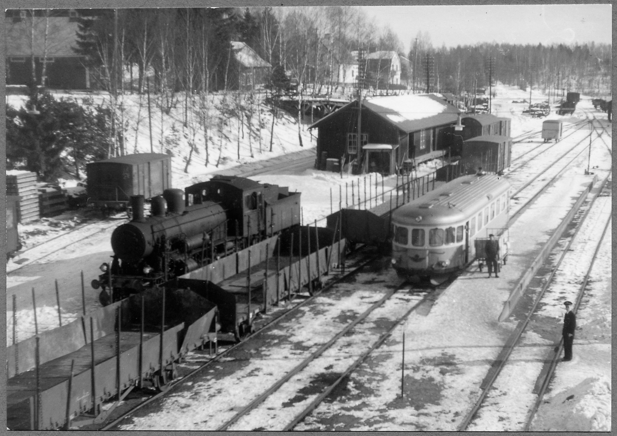 Bangårdsområde i Åtvidaberg. Lokalgodståg och motorvagn Yo8 på nornalspåret.