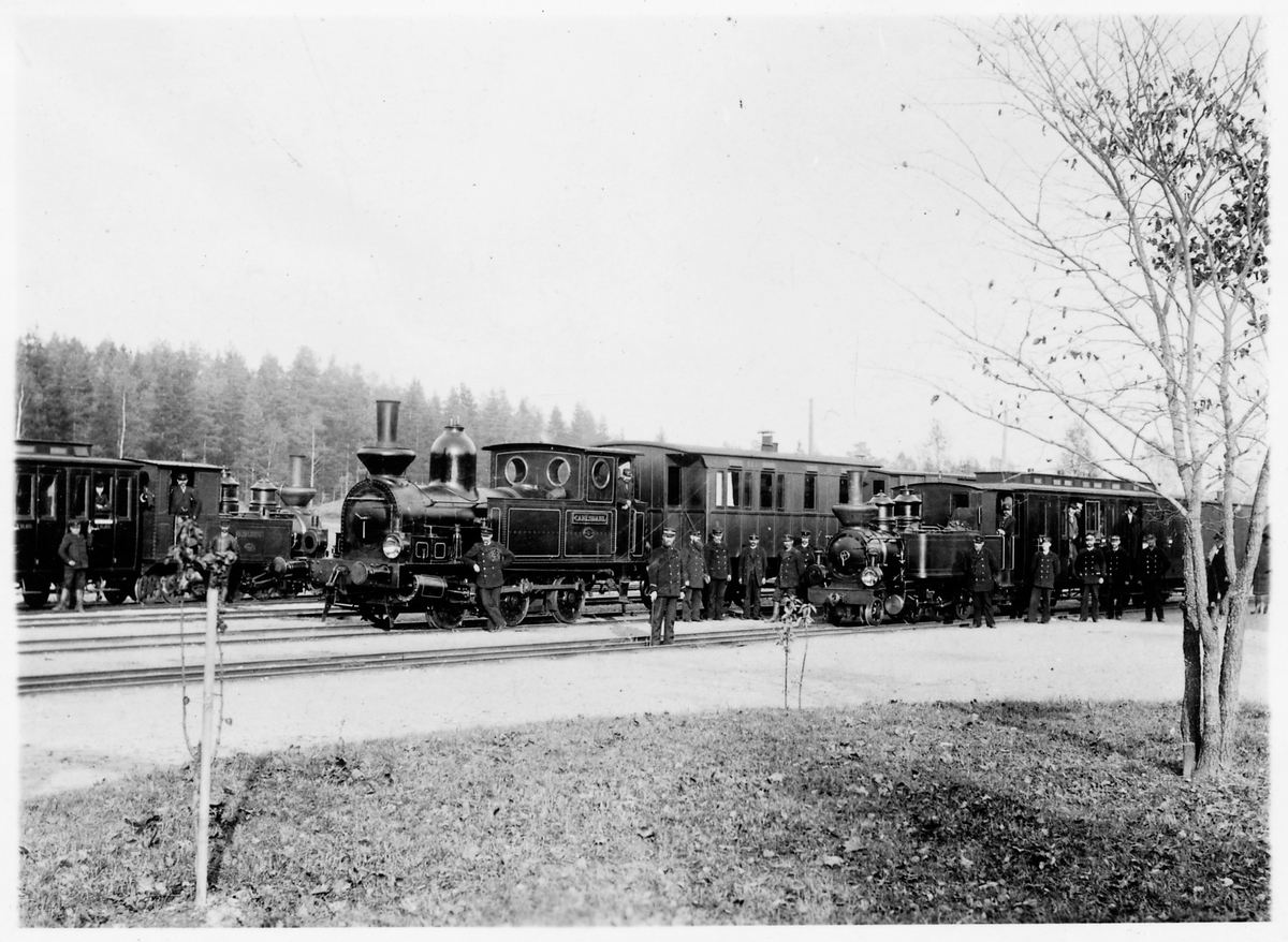 Vikern-Möckelns Järnväg, WMJ lok 1 "Degerfors", Nora - Karlskoga Järnväg, NKJ lok 6 "Carlsdahl", WMJ lok 4 på stationen i Striberg.