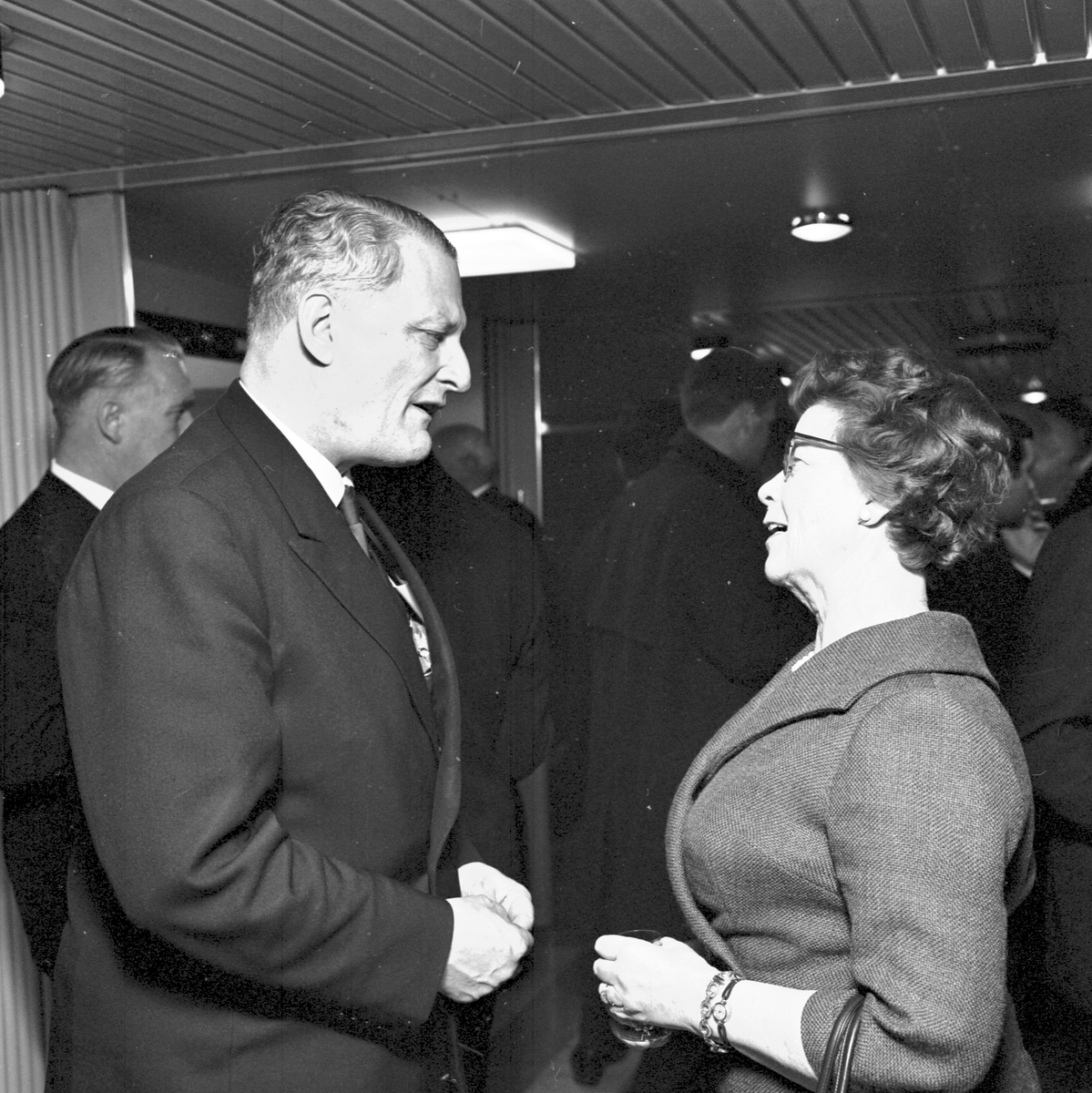 Invigningsresa med M/S "Gustav Vasa". Levererades 10 april 1965 till Lion Ferry Ab, Halmstad. Utchartrad samma dag till Statens Järnvägar, SJ, Malmö. Generaldirektör, Gd, Erik Upmark, till vänster