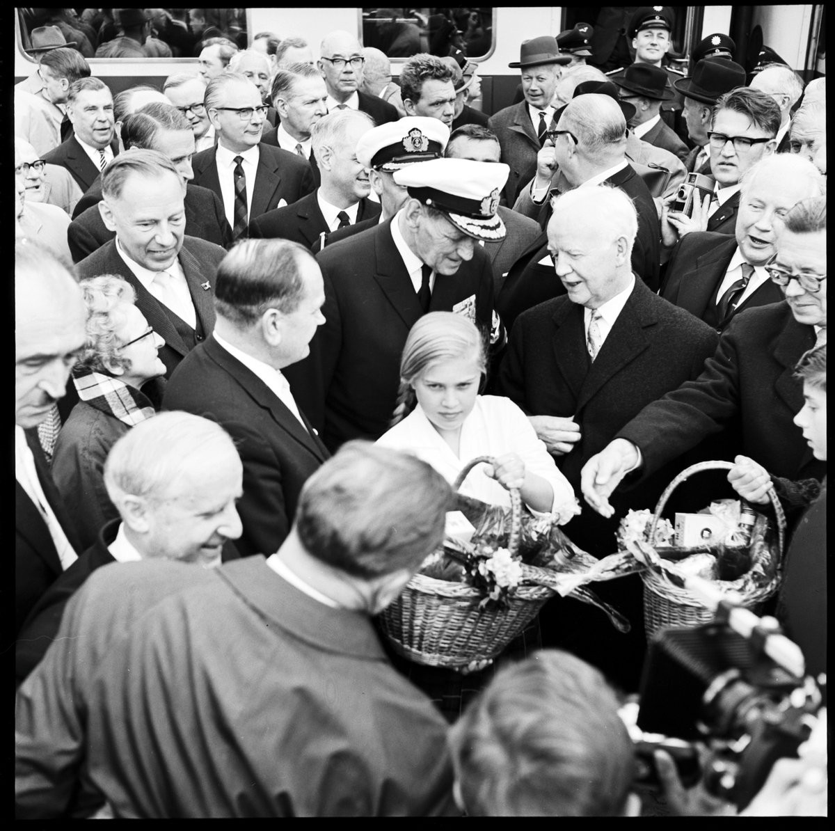 Invigning av "Fågelvägslinjen" mellan Rodbyhavn, Lolland, Danmark och Puttgarden, Fehmarn, Tyskland. Den nya färjelinjen kallas "Fågelvägslinjen", på danska Fugleflugtslinien och på tyska Vogelflugslinie, eftersom linjen följer flyttfåglarnas flygrutt. Danmarks kung Frederik IX, i mitten, bakom flickan med blomkorgen
