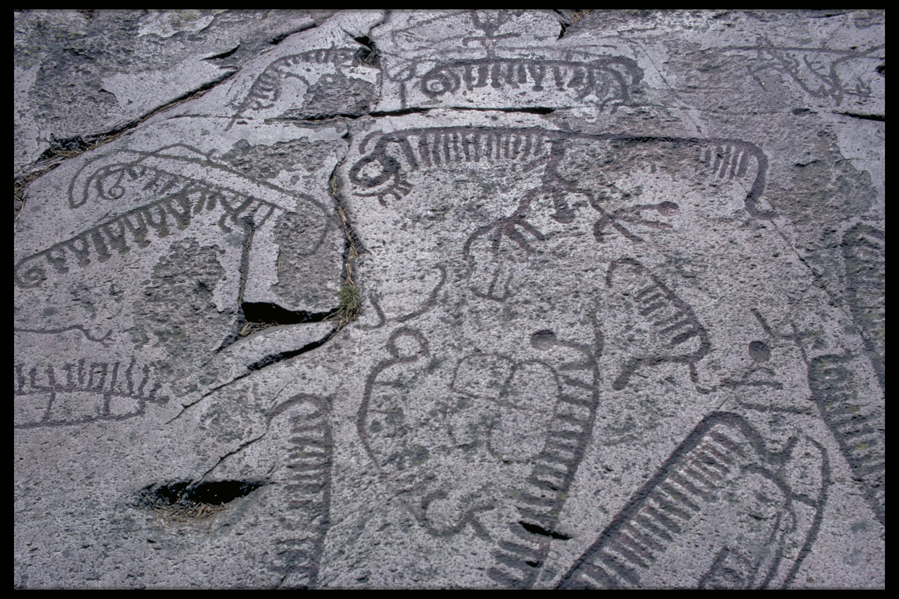 Hällristning med bl a skeppsmotiv. Bilden troligen från omkring 1970.