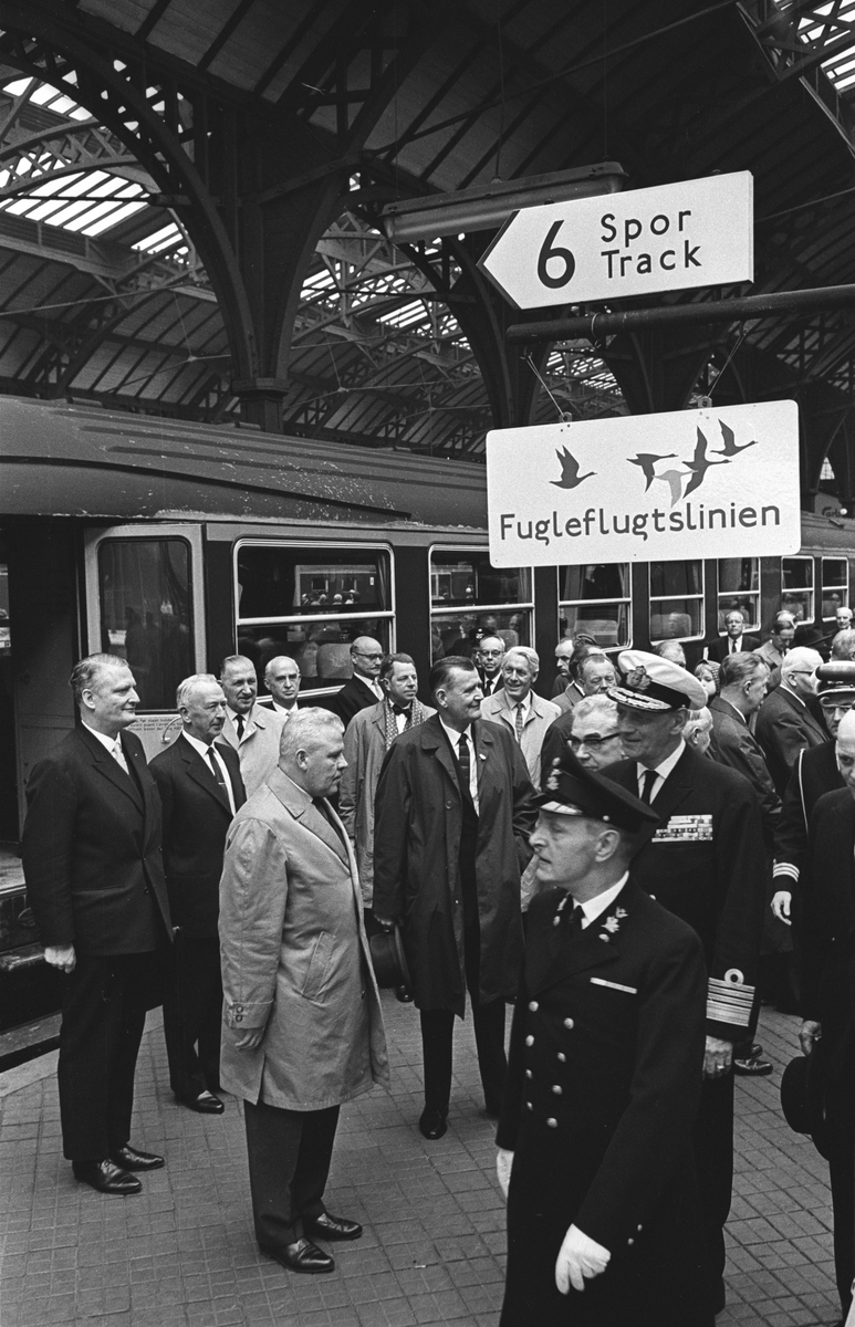 Invigning av "Fågelvägslinjen" mellan Rodbyhavn, Lolland, Danmark och Puttgarden, Fehmarn, Tyskland. Den nya färjelinjen kallas "Fågelvägslinjen", på danska Fugleflugtslinien och på tyska Vogelflugslinie, eftersom linjen följer flyttfåglarnas flygrutt. Generaldirektör, Gd, Erik Upmark, 1:a från vänster och Danmarks kung Frederik IX, 2:a från höger
