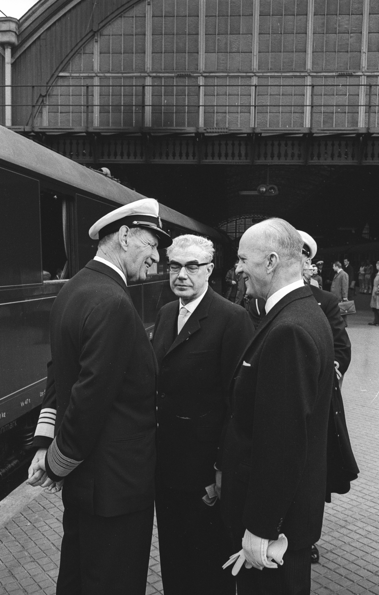 Invigning av "Fågelvägslinjen" mellan Rodbyhavn, Lolland, Danmark och Puttgarden, Fehmarn, Tyskland. Den nya färjelinjen kallas "Fågelvägslinjen", på danska Fugleflugtslinien och på tyska Vogelflugslinie, eftersom linjen följer flyttfåglarnas flygrutt. Danmarks kung Frederik IX, 1:a från vänster