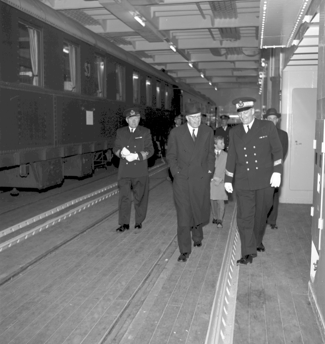 Titel: Kungabesöket på tågfärjan "Trelleborg" i Stockholm, Gustav VI Adolf och kronprins Carl Gustaf sedemera Carl XVI Gustaf. Generaldirektör Erik Upmark