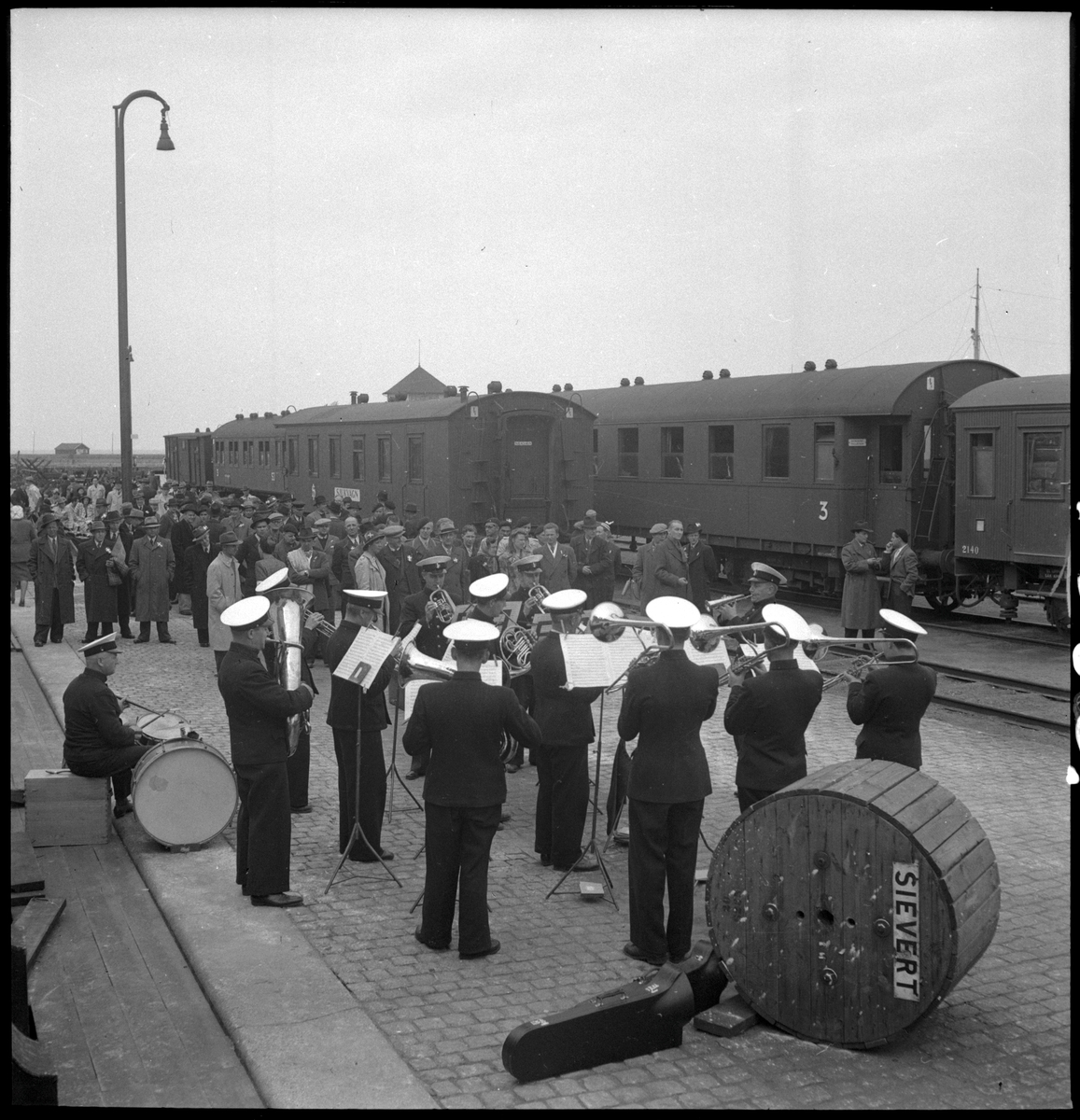 Hemtransport av danska flyktingar, här vid Malmö färjestation. SJ BC07 2140. Orkester.