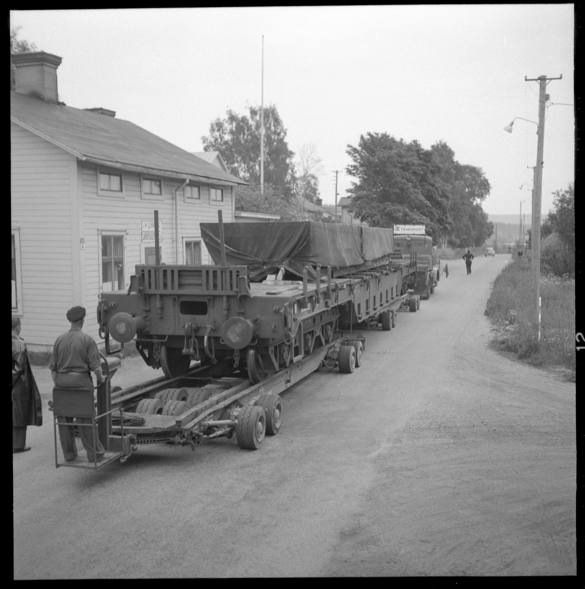 Statens Järnvägar, SJ Sdu 100403. Specialtransport till Ortviken pappersbruk. Fundament för slipmaskin. Vagnbjörn för vägtransport. Personal på plattform för bakhjulstyrning