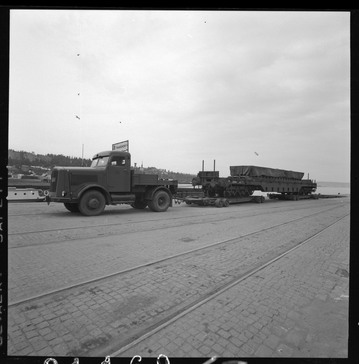 Statens Järnvägar, SJ Sdu 100403. Specialtransport med vagnbjörn. Fundament för slipmaskin till Ortviken pappersbruk