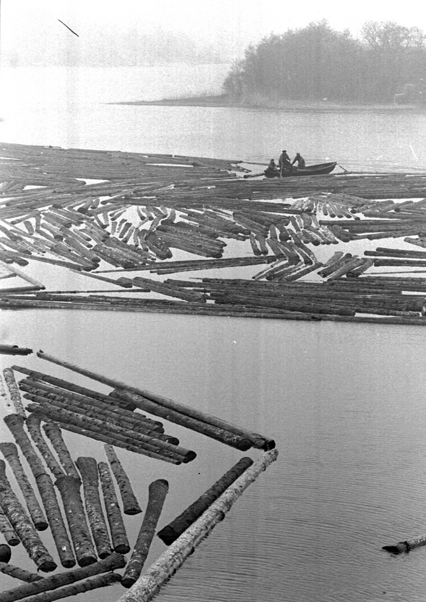 Ålandsresa. Skärgård. Timmerflottning. Eka med timmerarbetare