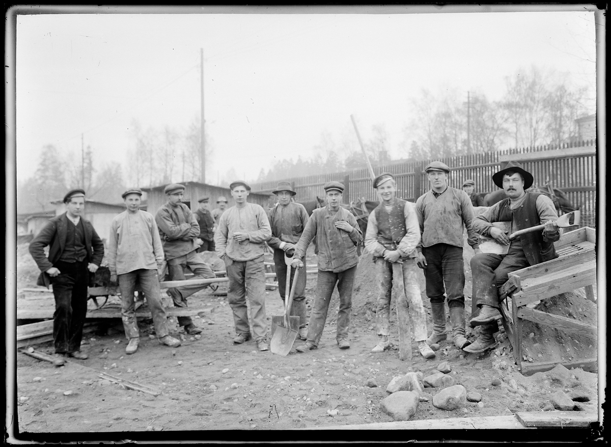 Gruppfoto taget under byggnation av verkstad, okänd ort.