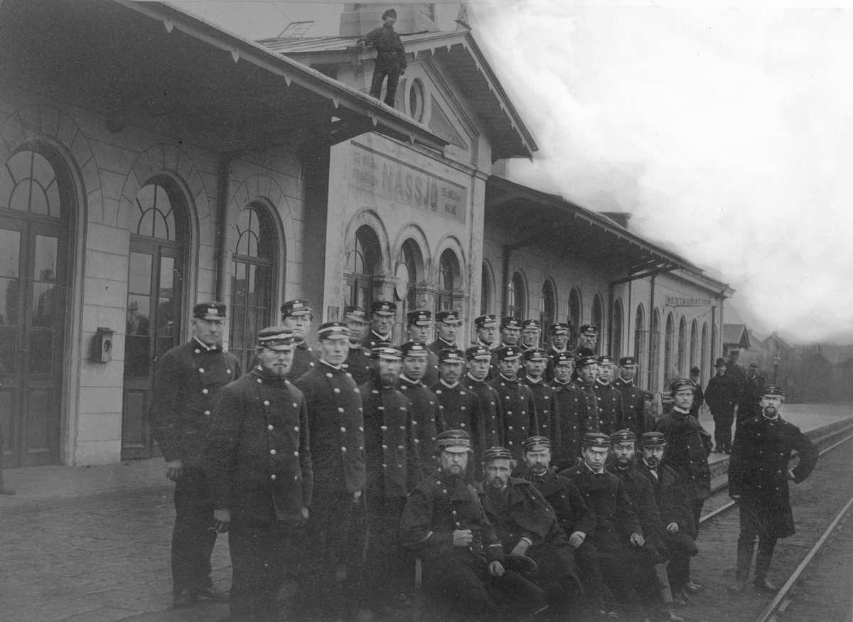Personal vid SJ poserar utanför Nässjö järnvägsstation.