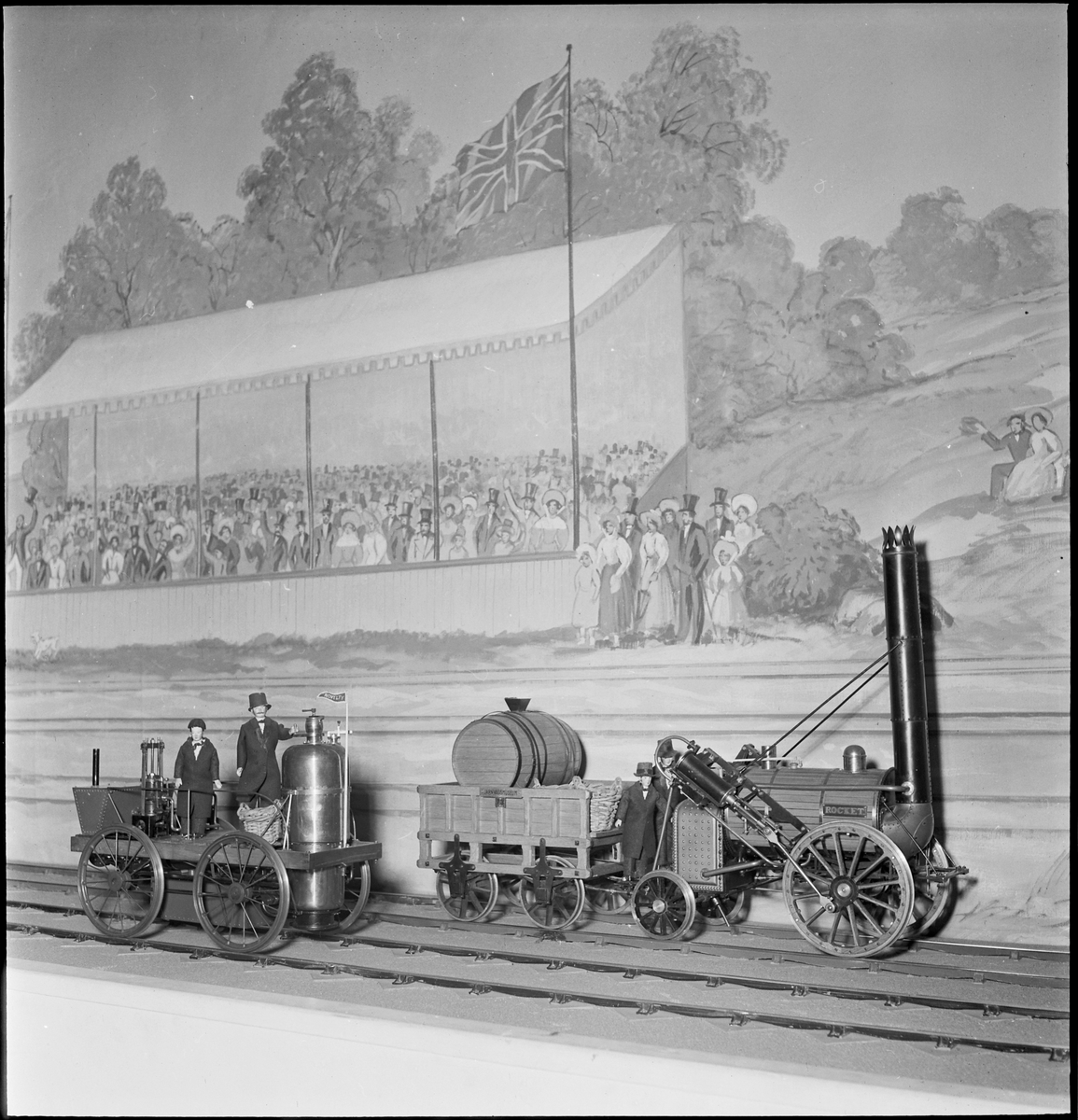 Titel: Modeller av Rocket och Novelty famför Rainhill bakgrund.