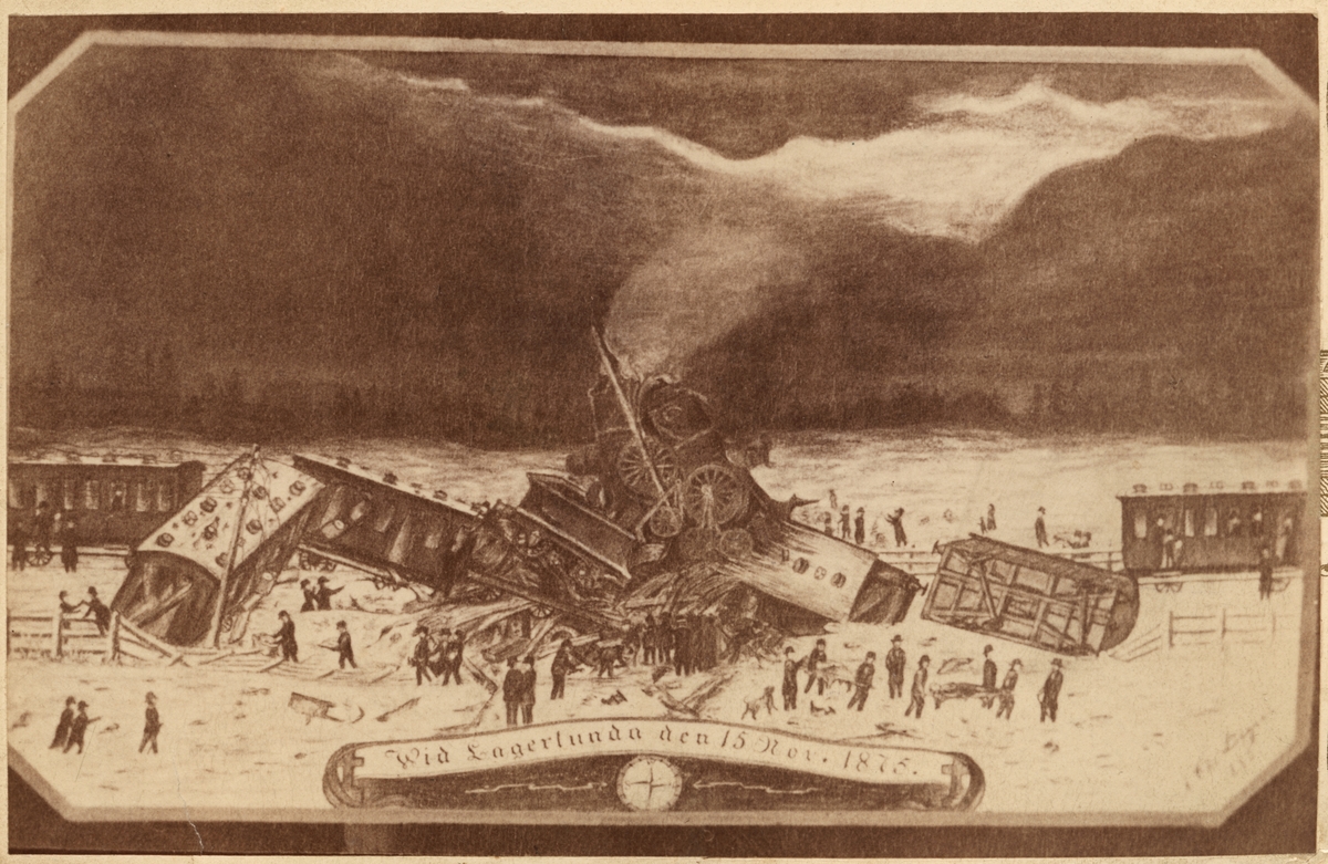 Tågolycka med lok, vagnar och folksamling i bild mellan Malmslätt och Vikingstad.