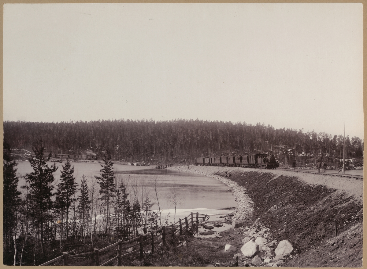 Vy på järnvägslinje vid Piteälven mellan Älvsbyn och Älvsby Grusgrop. Banvallen har rasat mellan de två persontågen.