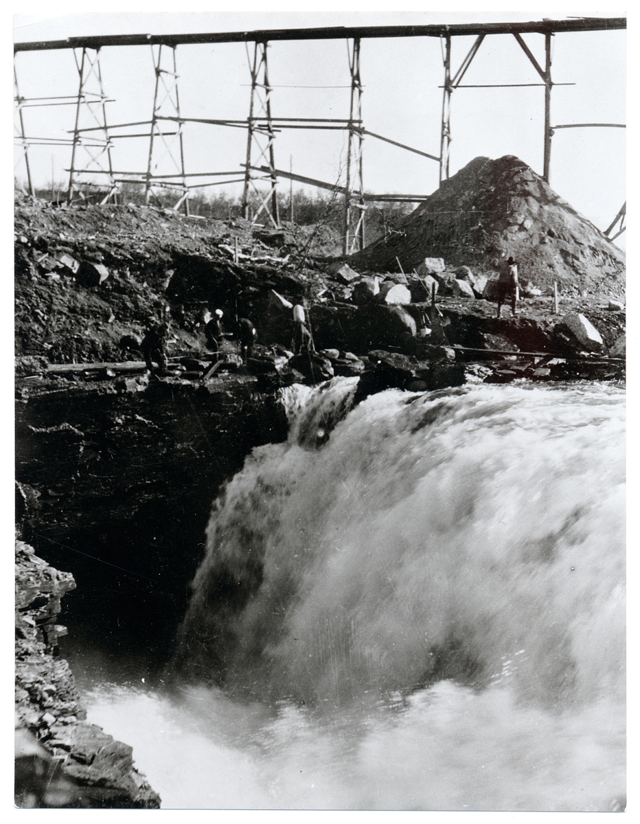 Vattentunneln vid Abiskojokk å. Riksgränsbanan under byggnadstiden.