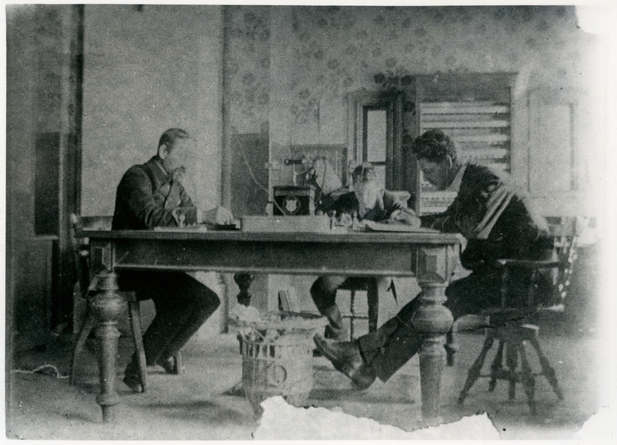 Skutskär interiör av expeditionen år 1908. Fr.v stins D.J. Spångberg. Tillförordnat skrivbiträde sonen T. Spångberg, senare telegrafföreståndare, 1938 till järnvägsmuseet, från 1944 chef för järnvägsmuseet, till höger K.G. Morén.