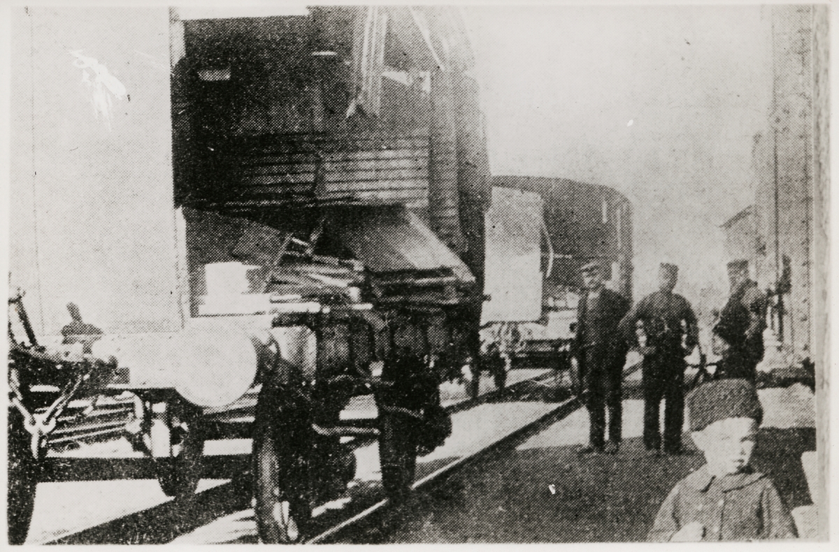 Skadade godsvagnar efter urspårning vid bangård med personal och barn i bild.