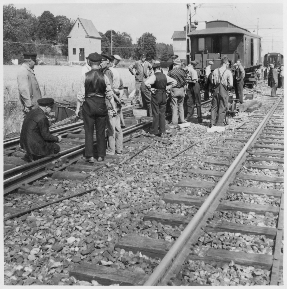 Personal vid växel efter tågolycka med vagn i bakgrunden.