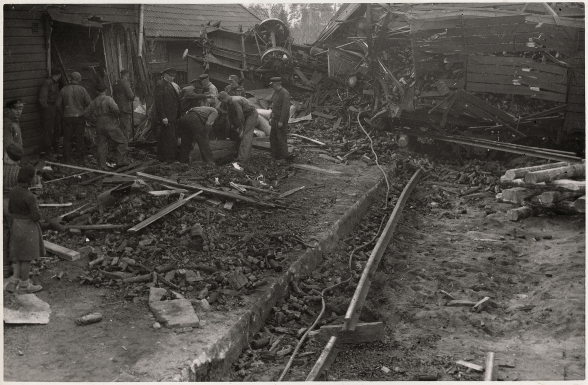 Arbete vid stationshus och olycksplats efter urspårning av godsvagn.