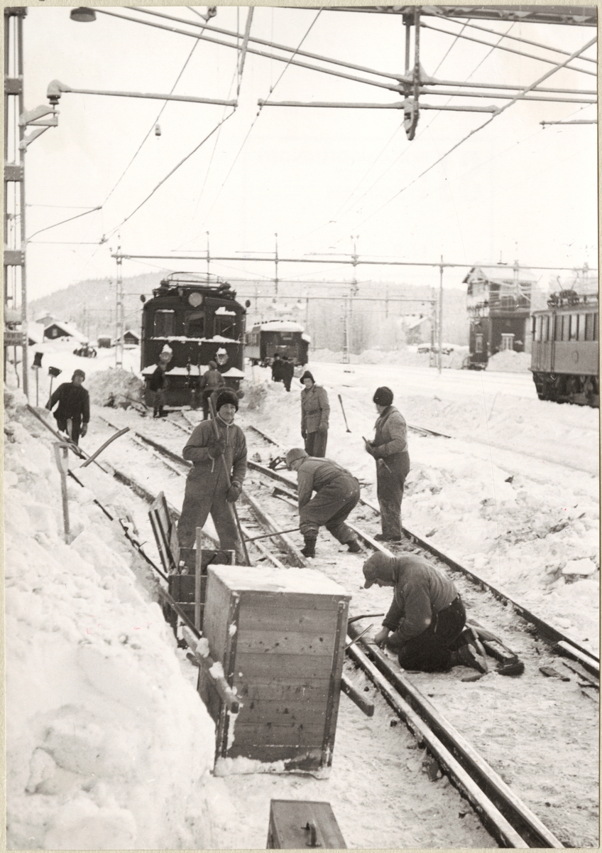 Reparationsarbete efter urspårning under vintertid med personal och ellok i bild.