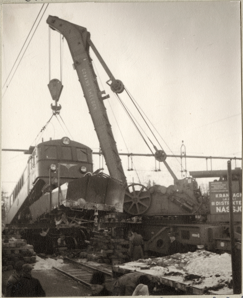 Statens Järnvägar, SJ ångkran A1 "Nässjö" lyfter lok och godsvagnar efter tågolycka.