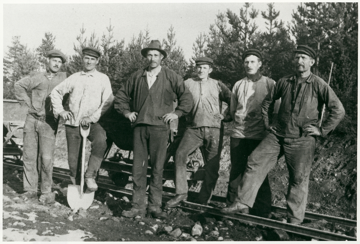 Rallarlag uppställda för fotografering. Från vänster G Skog, Adam Lundin, okänd, okänd, Ragnar Hillman och eventuellt Österberg.