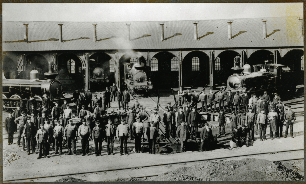 Gävle Dala Järnvägars lokstall. Ånglok GDJ B 7 "Pan", GDJ E 29 "P.Murén", GDJ B 25 "Finn" och GDJ E 30 "W. Nisser".