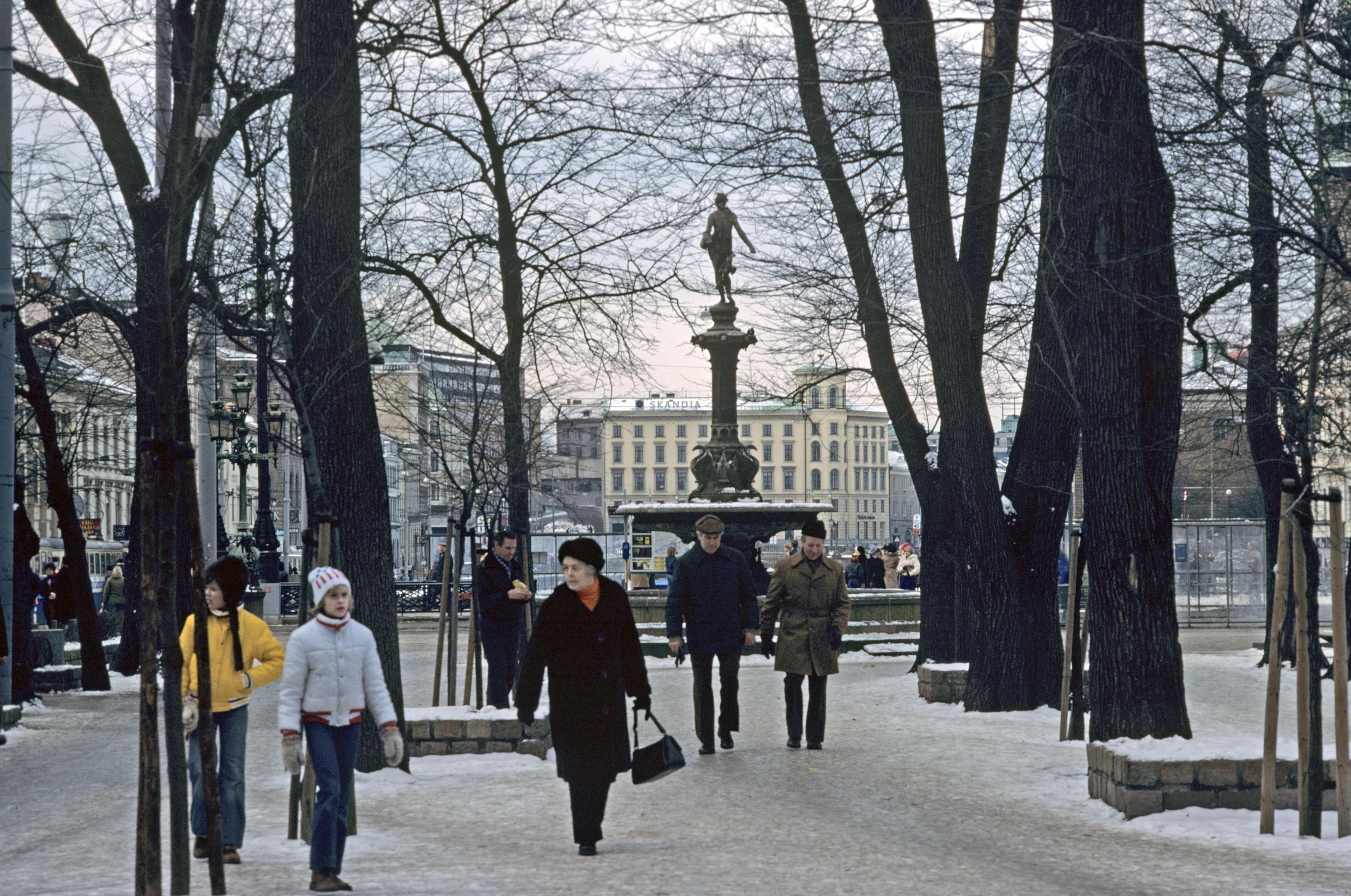 Bild över parken med statyn Såningskvinnan centralt i bakgrunden.
