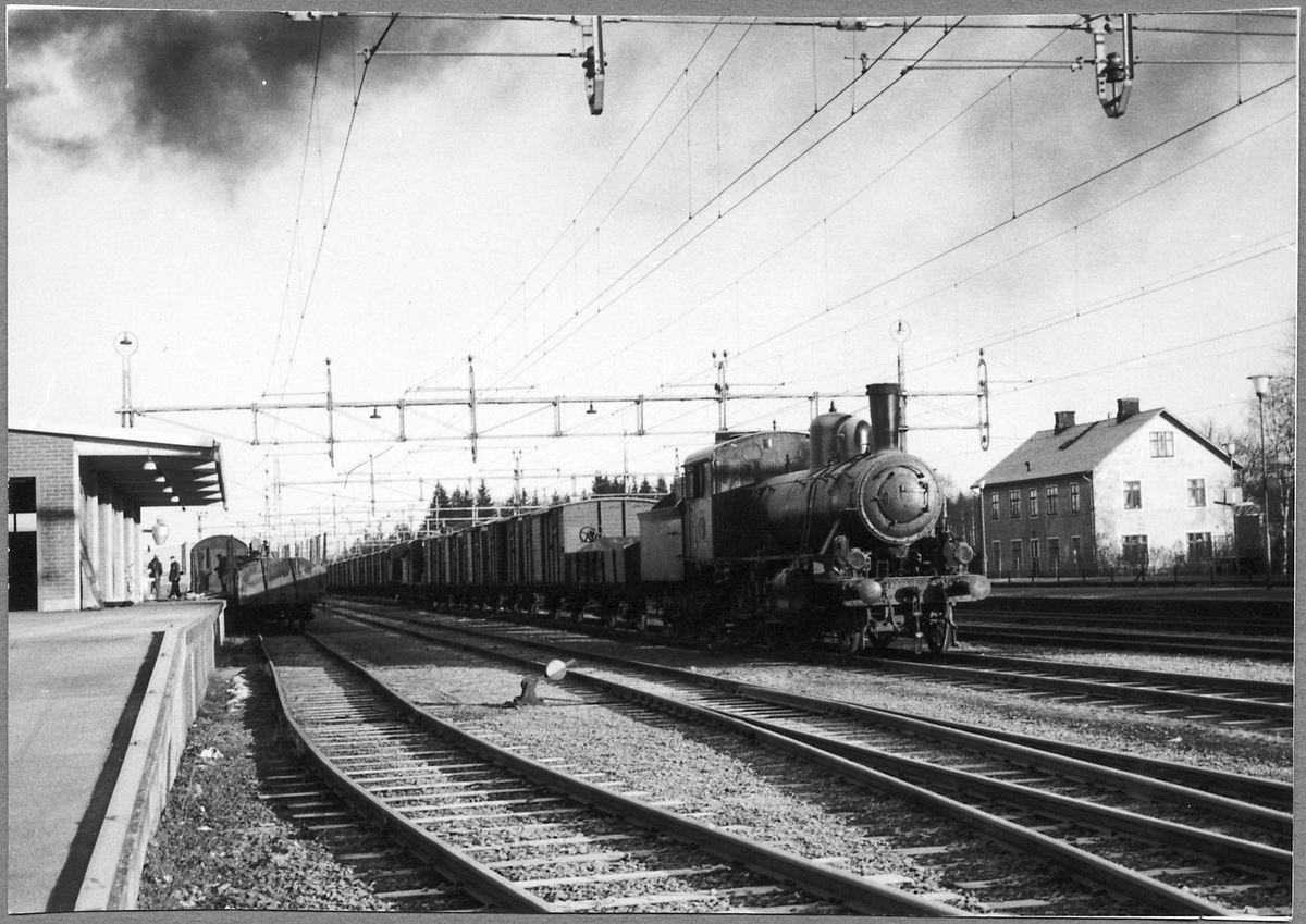 Statens Järnvägar, SJ L 971 med tågsätt i Vislanda på väg mot skrotningsplatsen.
