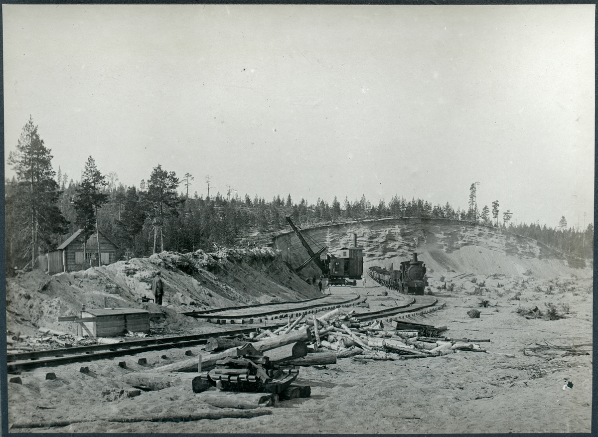 En Orenstein & Koppel ånggrävmaskin, samt ett ånglok med öppna godsvagnar för lastning, i grusgropen vid Gallbergsträsk.