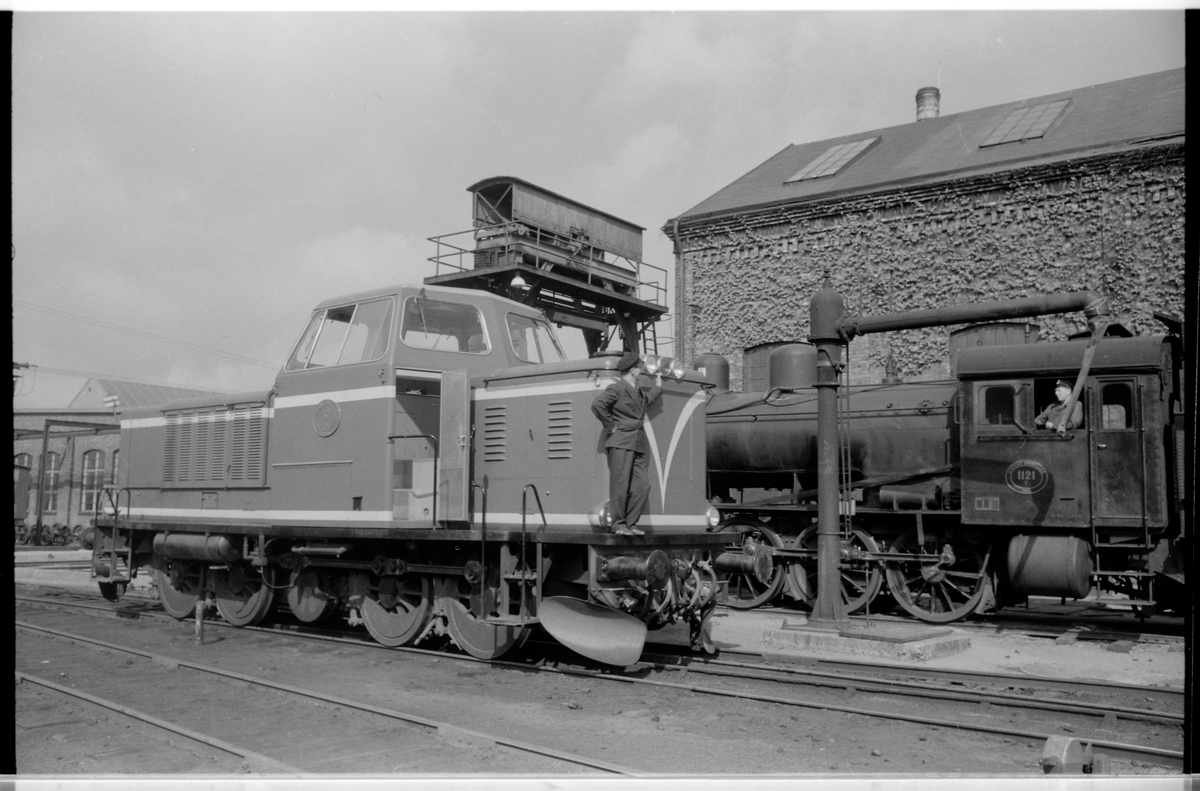 Statens Järnvägar, SJ Zs 57 och SJ E2 1121 vid lokstallen, Halmstad C.