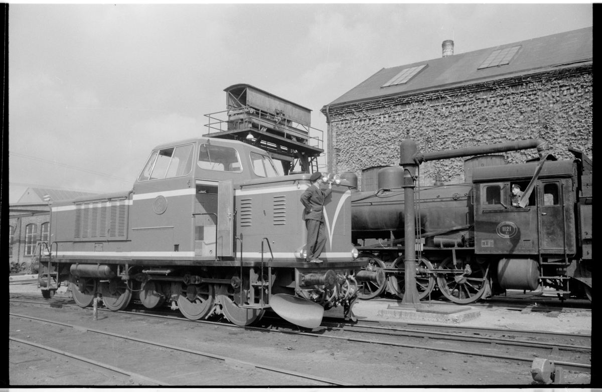 Statens Järnvägar, SJ Zs 57 och SJ E2 1121 vid lokstallen, Halmstad C.