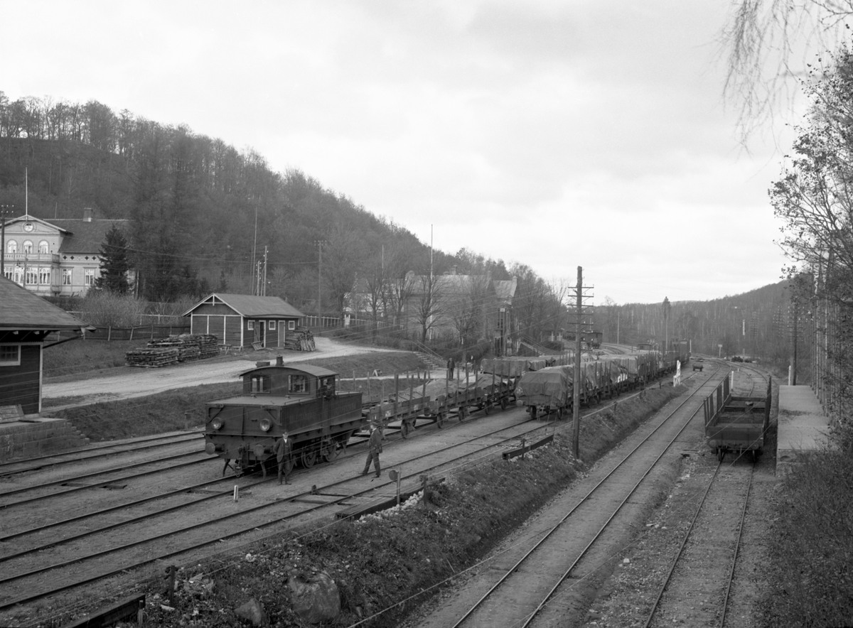 Oskarsström station. Lokomotor med godståg. Oskarsströms Sulfitfabrik.