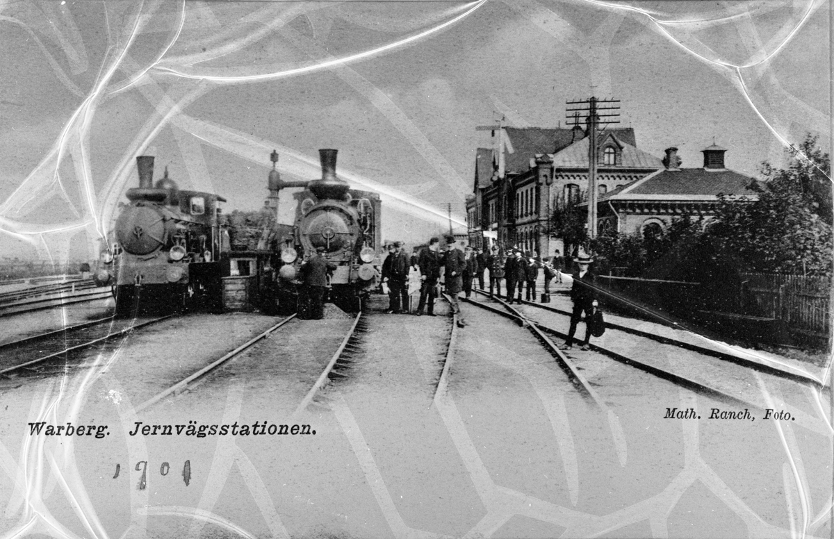 Varberg Järnvägsstationen. Stationshuset och bangården ombygges under flera omgångar på 1920-talet. Då förlängdes stationshus i båda ändar. Här syns huset efter tillbyggnaden. Tiden som står på fotot är innan ombyggnaden. Då stationshus såg annorlunda ut.