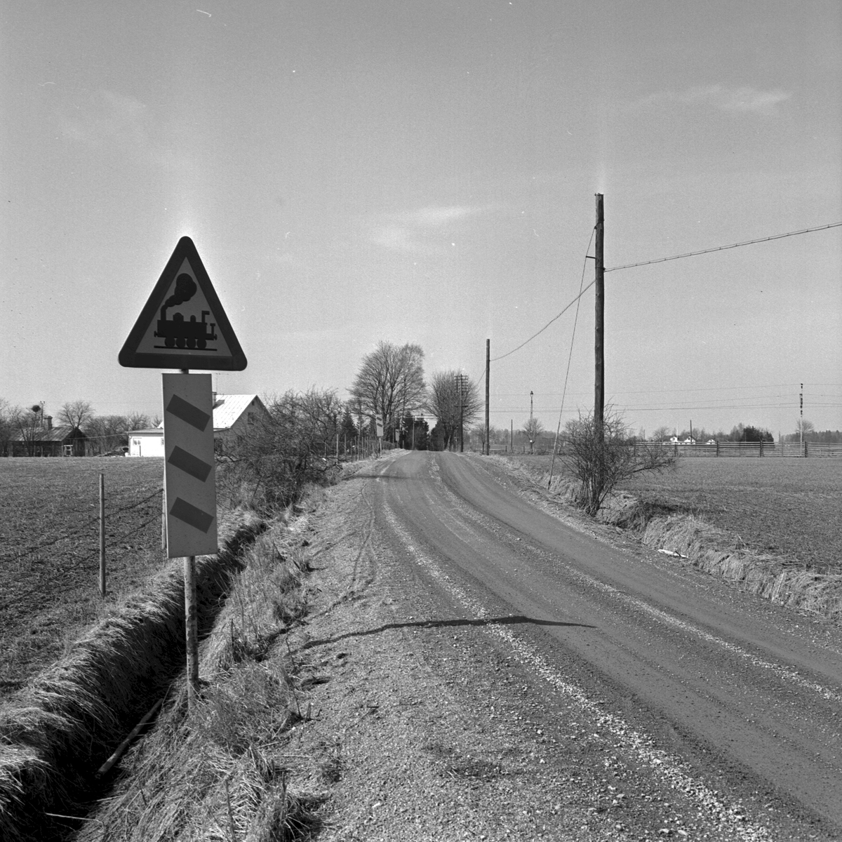Vägskyltar. Järnvägskorsning, utan bommar. Avstånd till plankorsning t ex järnväg