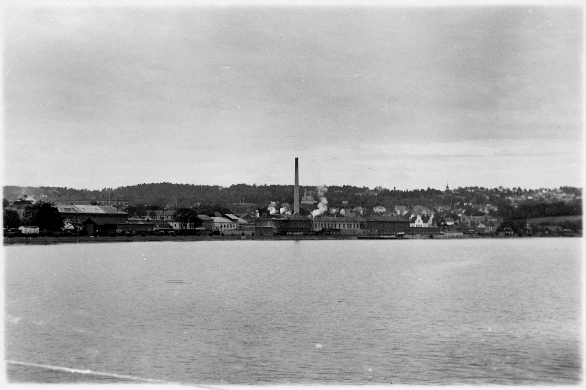 Vy över Jönköping där Svenska Tändsticksfabrikens skorsten ses i mittten av bilden.