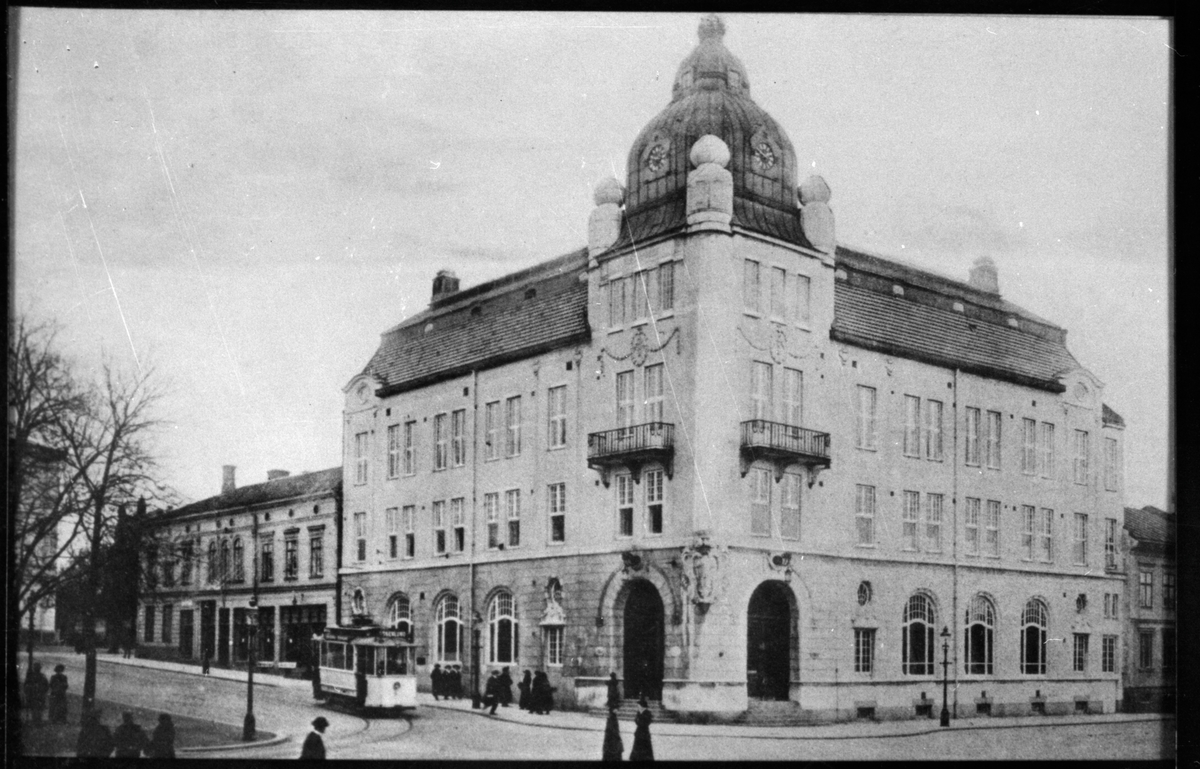 Spårvagnstrafik utanför post- och telegrafhuset vid Järnvägstorget i Jönköping i hörnet av Parkgatan-Järnvägsgatan.