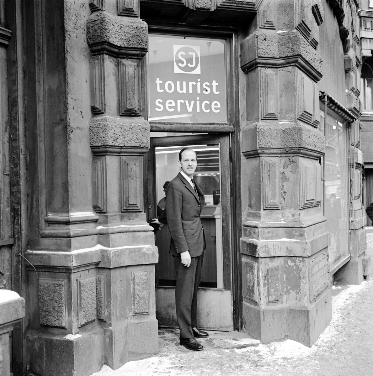 Statens Järnvägar SJ turistbyrå. Förste Byråsekreterare, Fbrs, S Törneheim poserar framför entrédörren.