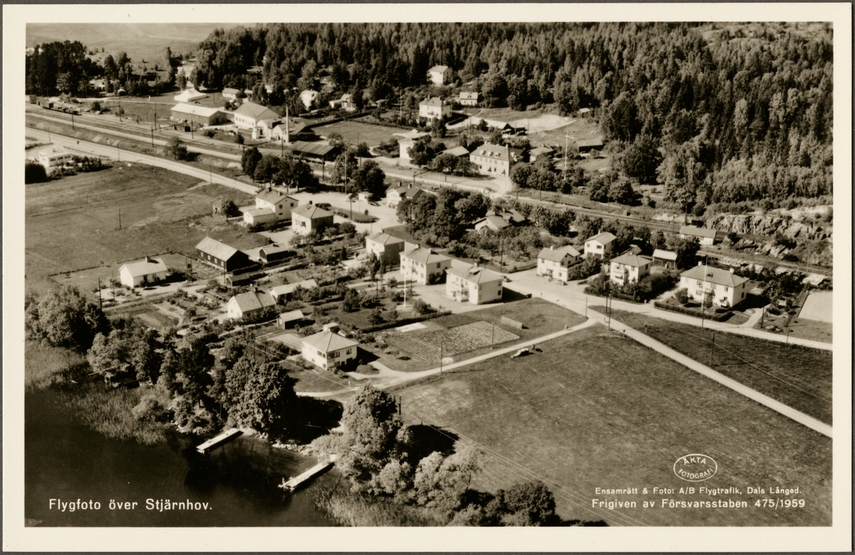 Flygfoto över samhälle med stationsområde och vattendrag i bild.