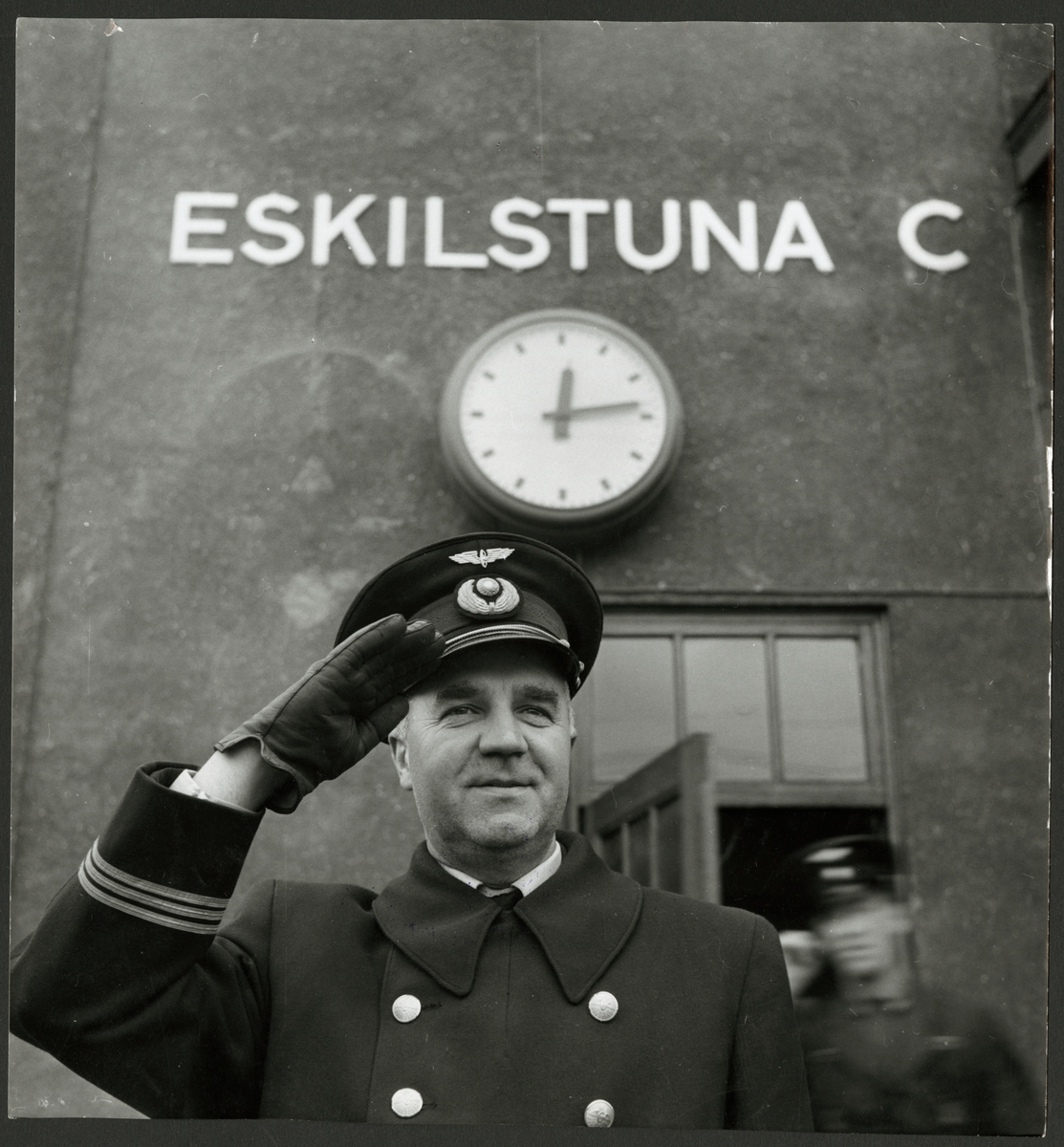 Stins Gustaf Blom gör honnör framför Eskilstuna C stationshus.