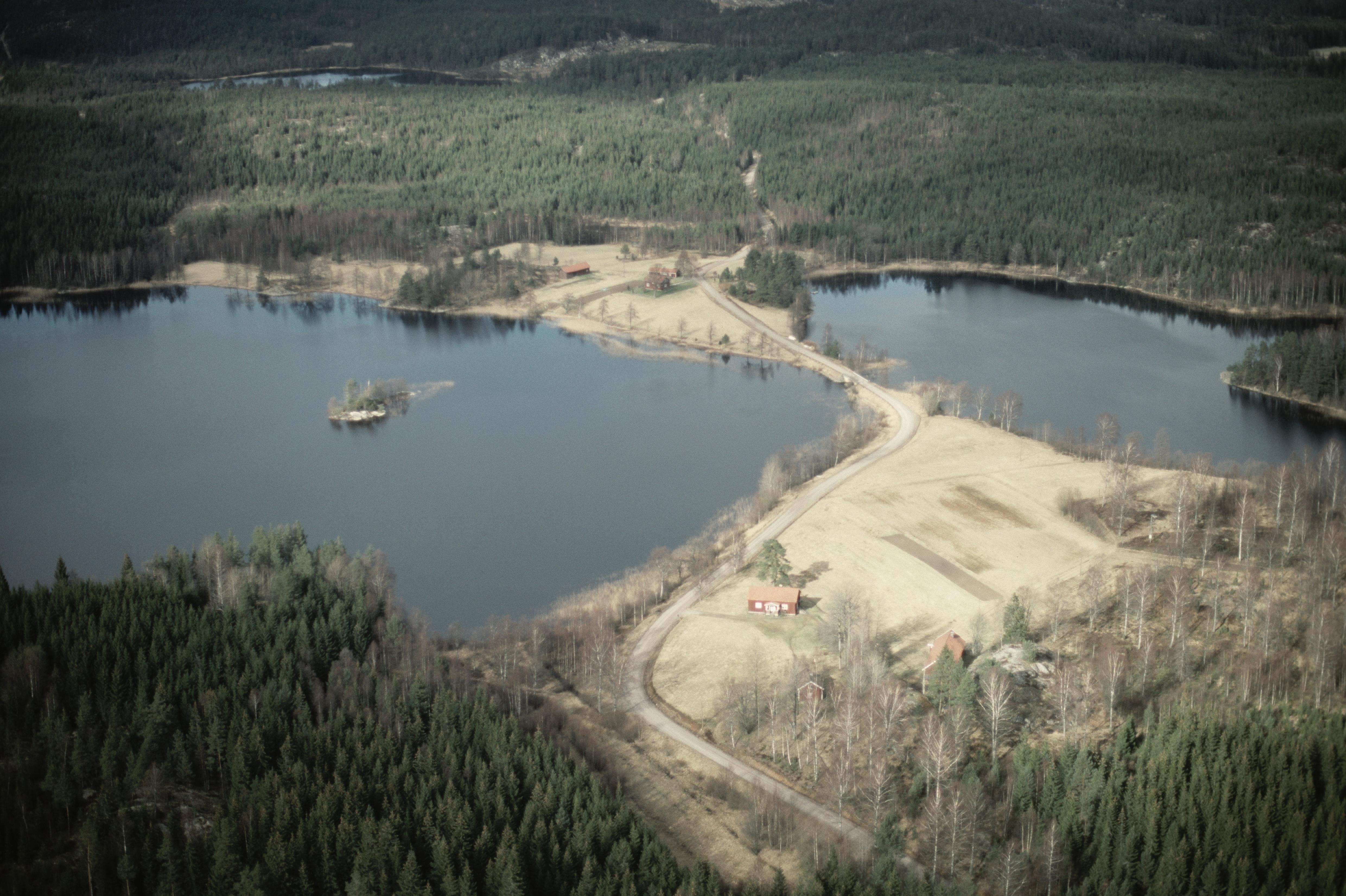 Torpmiljö vid Södra Kornsjön. Torpet Gräsön i bildens nedre del, vid bildens mitt torpet Holmen. Bilden är tagen mot (väderstreck): NNO