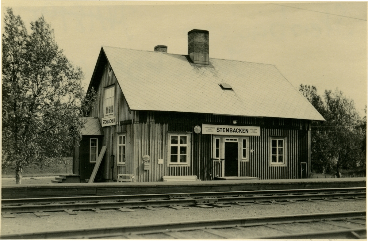 Stenbackens station. Statens Järnvägar, SJ. Banan öppnad 1903. Banan elektrifierades 1915. Stationshuset byggd 1902 och sålt 1998.