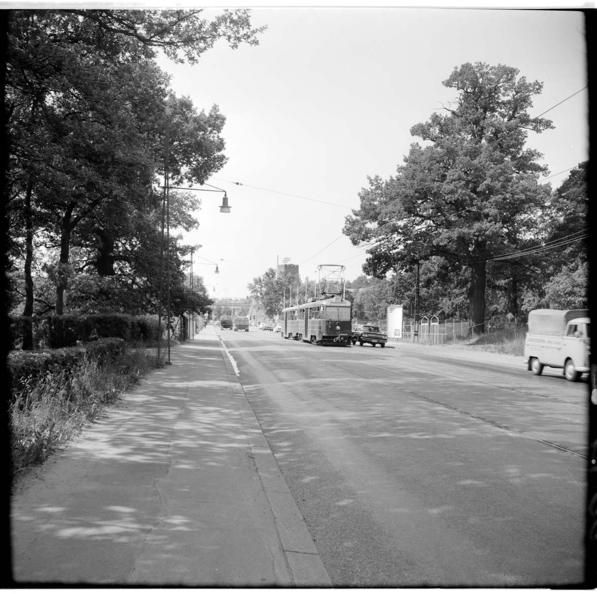 Trafik Aktiebolaget Stockholm Södra Lidingöns Järnväg, SSLidJ A24B 17 "ängbyvagn". Tåg mot Lidingö på Lidingövägen vid K1. I fonden Stadion.