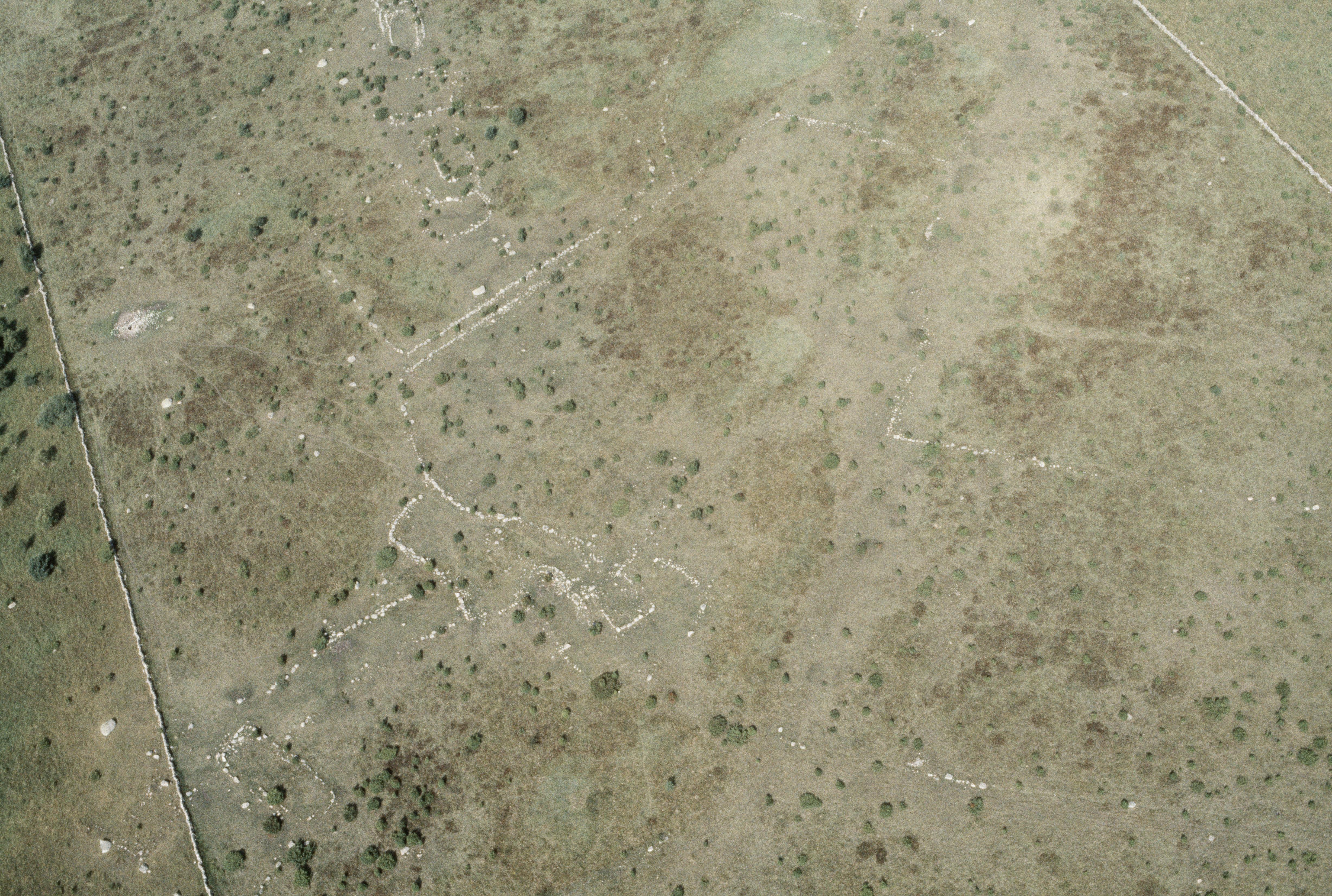 Jättegravarna vid Slatekärr. Hägnadssystem RAÄnr Löt 65:12 och husgrunder RAÄnr Löt 65:4, 65:5, 65:6, 65:9 m.fl. Bilden är tagen mot (väderstreck): VNV