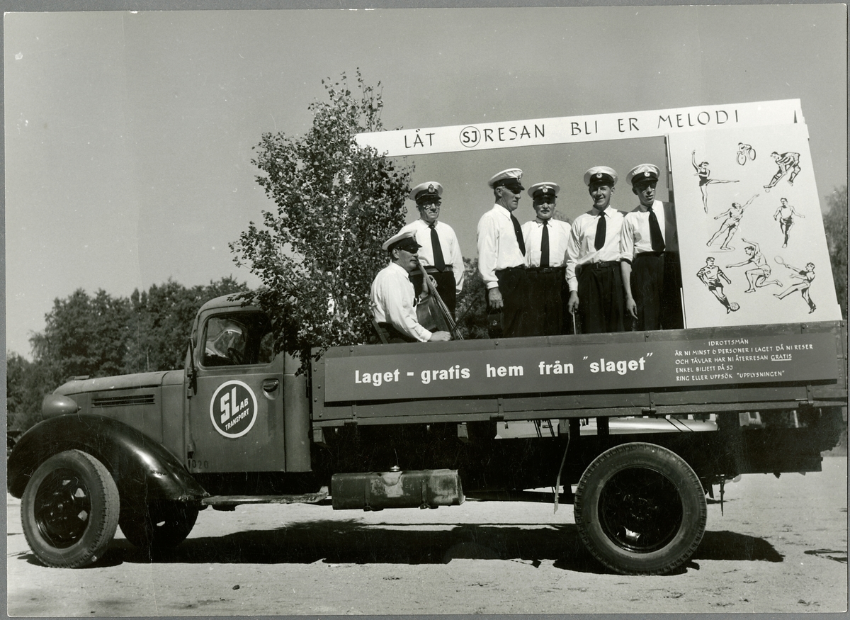 Svensk Lastbil AB, SLAB lastbil under Barnens Dag i Södertälje med ett musikband på flaket.