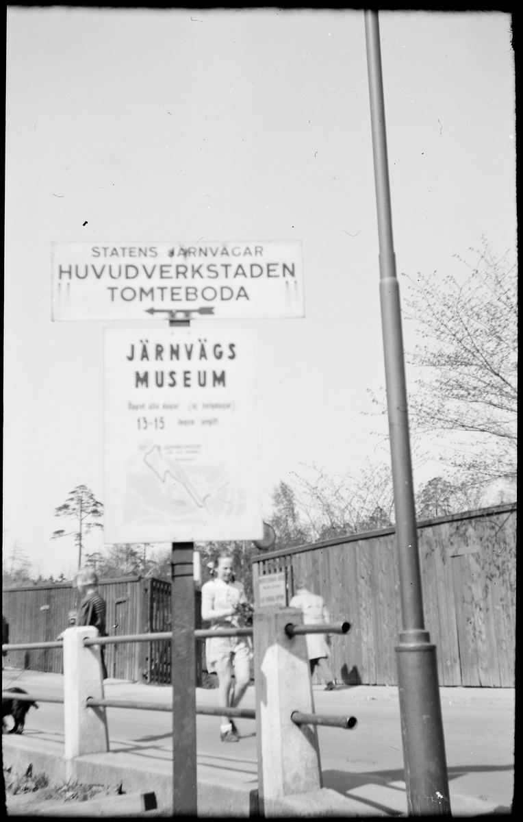 Hänvisningsskyltar till Statens Järnvägar, SJ Huvudverkstad och Järnvägsmuseum i Tomteboda.