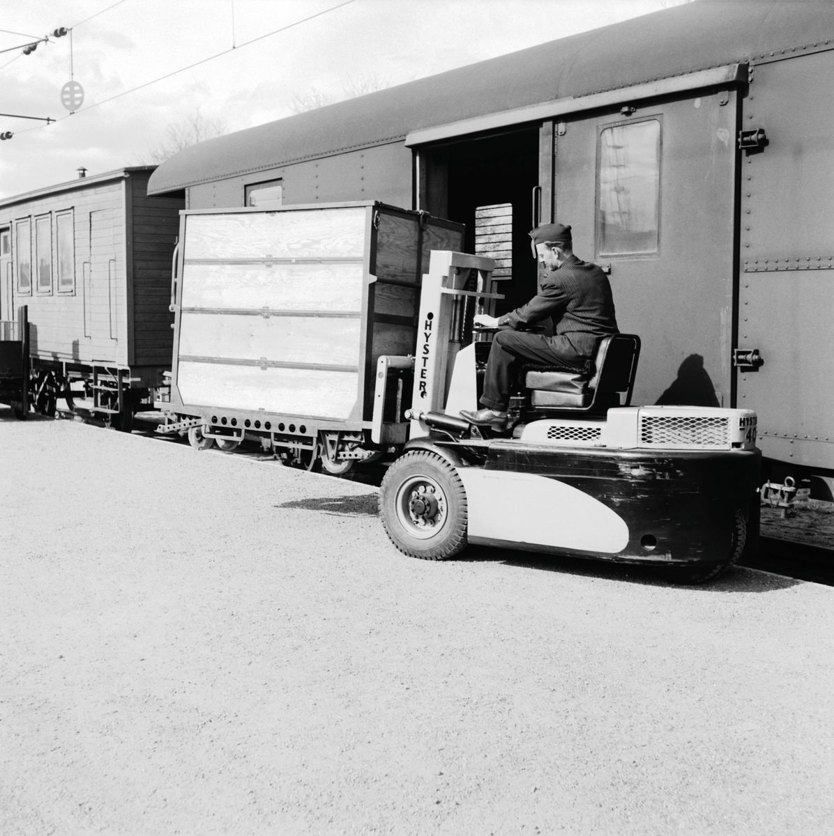 Last- och lossning av behållaren med gaffeltruck typ Hyster 40, lyftkapacitet 2,0 ton.