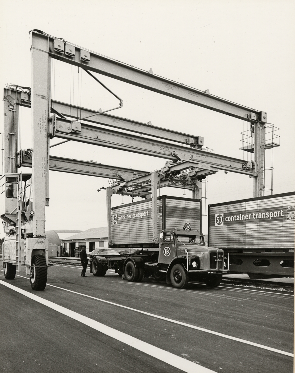 Kombitrafikens start 1965, SJ:s första containerterminal i Solna.