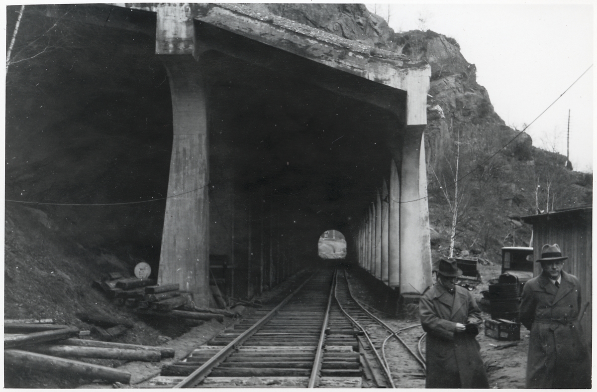 Bohusbanan inför elektrifieringen, banarbete vid galleriet av Lahagentunneln på linjen mellan Stenungssund och Ljungskile.