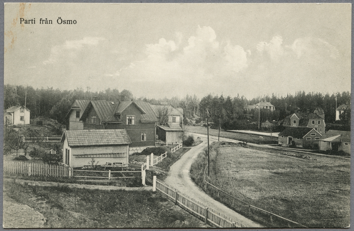 Vy över Ösmo med stationshuset skymtande bakom järnvägen.